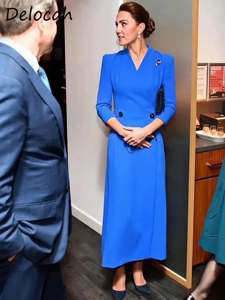 Delocah 2022 Весенняя женская модная взлетно-посадочной полосы вечерние платье трапециевидной формы платье принцессы синего цвета Твердые Цвет принт элегантная тонкая женская миди платья