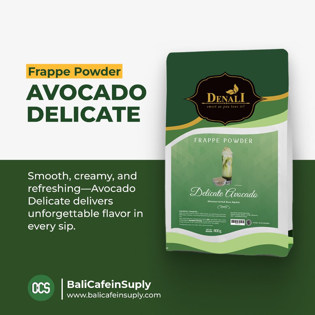 Avocado Delicate dari Denali Gourmet menghadirkan rasa alpukat yang lembut, creamy, dan menyegarkan—ideal untuk minuman yang ingin tampil beda namun tetap familiar. Diracik dari bahan berkualitas tinggi dan telah bersertifikasi Halal, powder ini cocok untuk campuran minuman berbasis kopi, non-kopi, hingga ice blended. Dengan penghargaan Brand Choice Award 2022 & 2023, Denali terus menjaga standar rasa dan kualitas yang dipercaya oleh bisnis kopi di seluruh Indonesia.