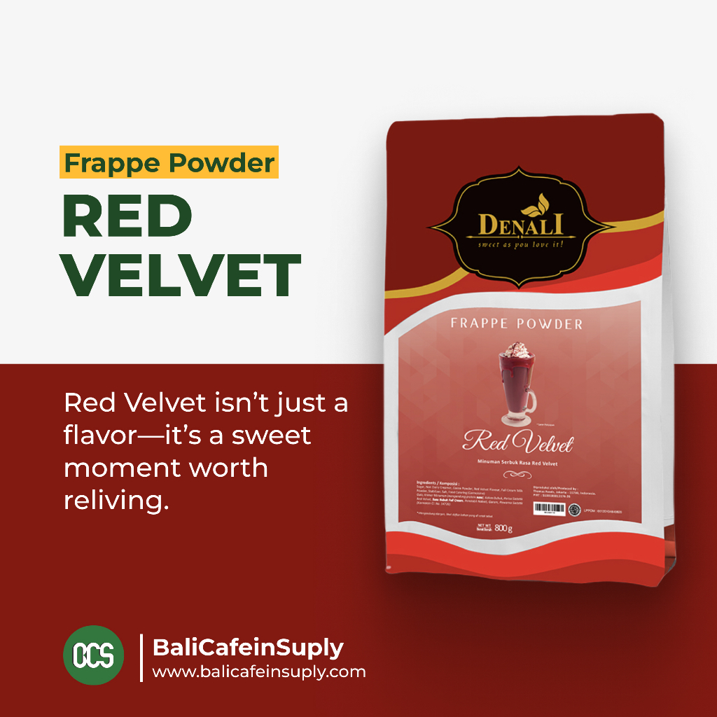 Red Velvet dari Denali Gourmet menghadirkan rasa manis yang lembut dengan aroma khas yang menggoda—menciptakan pengalaman minum yang elegan dan berkesan. Diracik dari bahan pilihan berkualitas tinggi dan telah bersertifikasi Halal, powder ini cocok untuk campuran minuman berbasis kopi, non-kopi, hingga ice blended. Dengan penghargaan Brand Choice Award 2022 & 2023, Denali terus menjadi pilihan utama bagi bisnis kopi yang mengutamakan kualitas dan daya tarik rasa.
