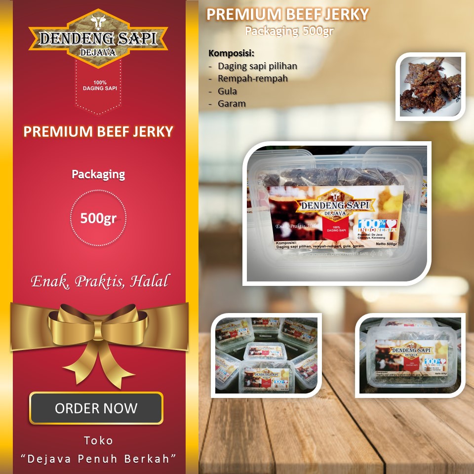 Dendeng Sapi Premium "Dejava" merupakan Dendeng Sapi dengan kualitas Premium yang terbuat dari daging sapi fresh pilihan. Diproses dengan bahan bumbu alami tanpa bahan pengawet sehingga rasanya enak, lezat dan gurih.