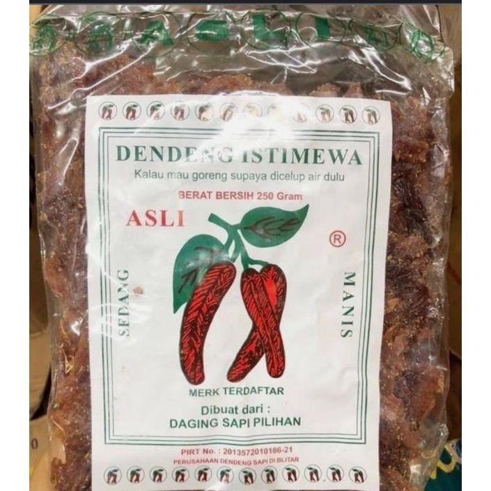 Dendeng sapi mentah cap Cabe 250gr ASLI & HALAL. Dendeng sapi masih diolah secara tradisional dan menggunakan bumbu rempah-rempah indonesia sesuai dengan standar resep keluarga secara turun temurun.rasanya asin gurih dan wangi ketumbar lebih kuat dibanding yang matang. umumnya dendeng ini sering dipakai di menu nasi ulam. dendeng dapat dijadikan sebagai snack tersendiri atau teman makan nasi putih, nasi ulam, roti sandwich dan bisa menjadi pengganti "bacon" untuk menu makanan HALAL. *Goreng dendeng terlebih dahulu sebelum dikonsumsi. caranya sebagai berikut: -rendam potongan dendeng di air, cukup sampai dendeng melembek. -panaskan minyak dan goreng dendeng cukup sampai wanginya keluar.(terlalu lama menggoreng dapat menyebabkan dendeng menjadi kering dan hilang juicynya). -angkat dan tiriskan. cocok sebagai oleh-oleh untuk teman,kerabat atau relasi kantor,dsb.