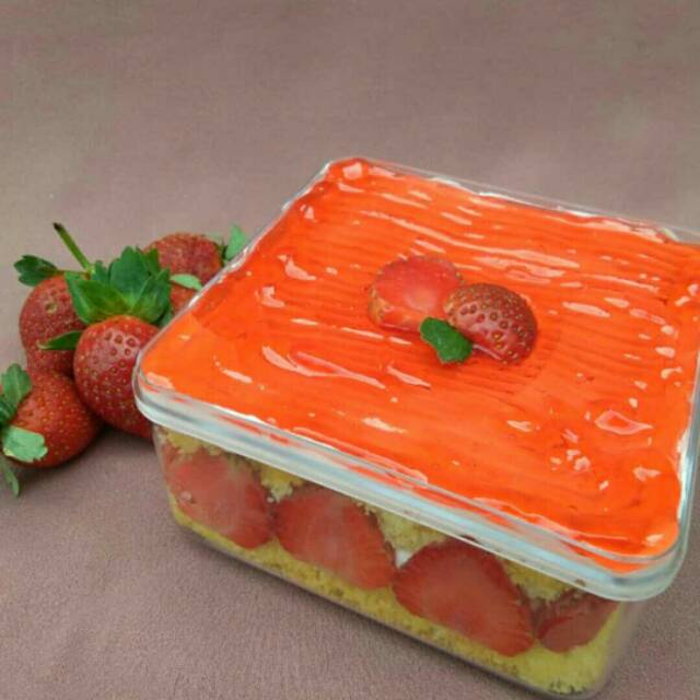 Dessert box Strawbery yang terdiri vanila cake yang lembut dilapisi cream strawberry dan potongan buah strawberry di tutup dengan selai strawberry yang manis