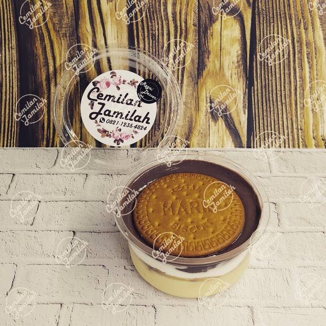 Puding Vanilla, dgn crumbs Marie Regal, di lapisi whipcream dan coklat ganache dan di top off dgn 1 biskuit Marie Regal diatasnya.