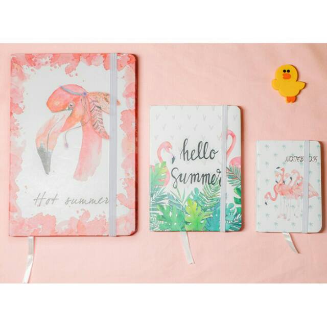 Diary Flamingo ini sampul terbuat dari bahan karton tebal, bagian dalam kertas bergaris. Bagian dalam terdapat pita sebagai penanda, dan terdapat karet pengikat di bagian luar untuk menutup buku dan menjepit pulpen. Motif bagus, warna beragam.