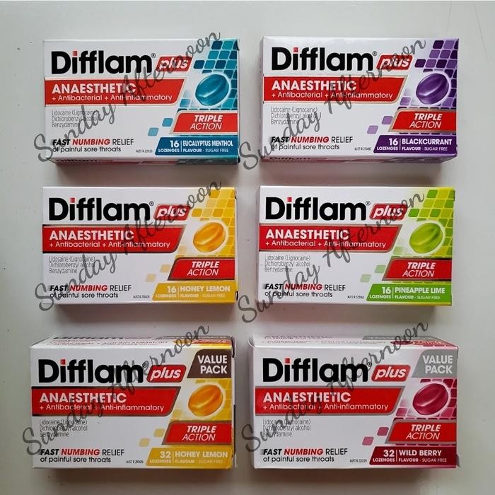 Difflam Plus Anaesthetic Sore Throat Lozenges have a triple action antibacterial + anti-inflammatory + anaesthetic formula for fast numbing relief of a sore throat.