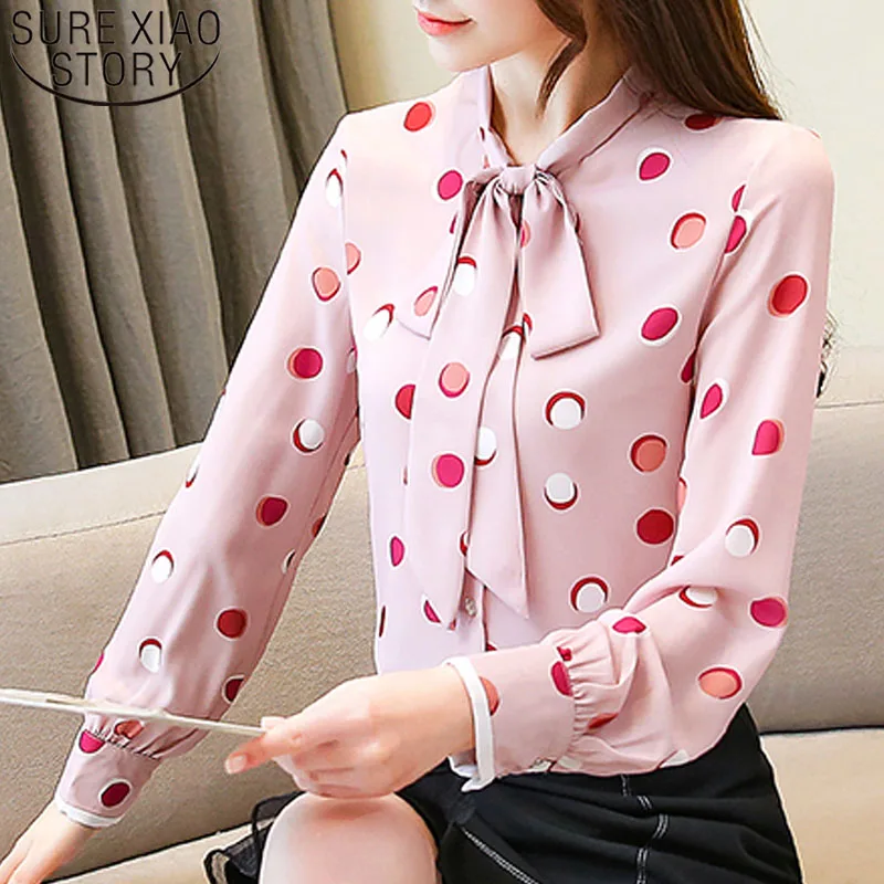 2019 Autumn Fashion Women Chiffon Blouses Casual Pink Dot Women Tops Long Sleeve Bow Women Clothing Office Lady 5561 50