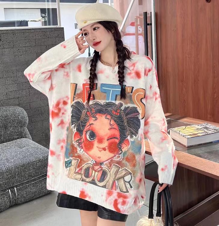 Dimanaf 2024 свитера больших размеров, пуловер со стразами, осенний женский свитер большого размера с принтом, розовый свитер с длинным рукавом, свободный свитер One Size белый