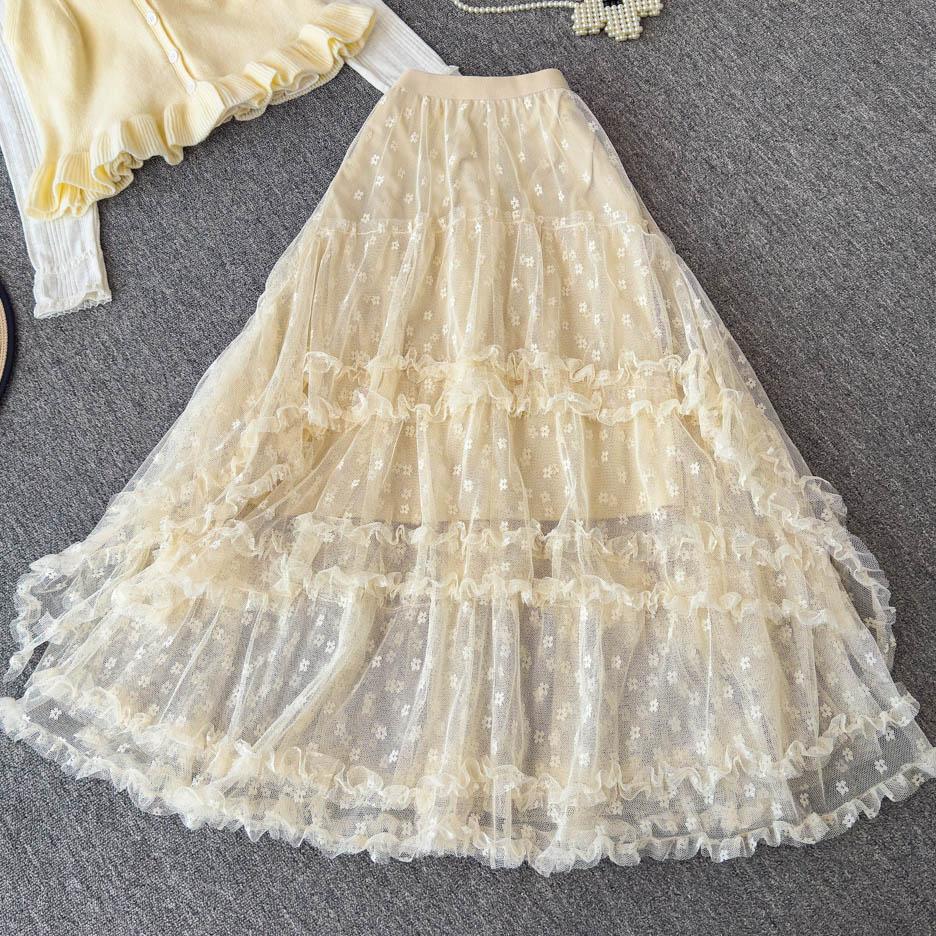 Dimanaf 2025 Весна Женские Новые Юбки Винтаж Свободные Эластичные Плиссированные Элегантные Белые Юбки Кружева Высокая Талия one size