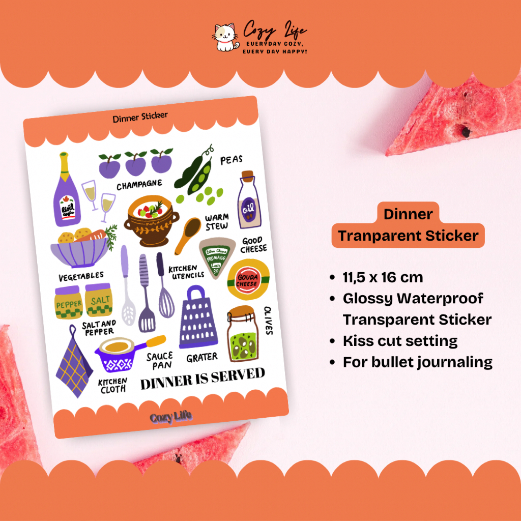 Lengkapi koleksi journaling atau dekorasi harianmu dengan Dinner Transparent Sticker dari Cozy Life! Stiker bertema makan malam ini hadir dengan ilustrasi lucu seperti peralatan dapur, bahan makanan, dan hidangan lezat yang akan mempercantik jurnal, planner, atau scrapbook-mu.