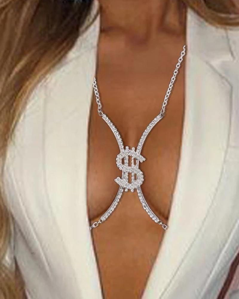 Dollar Pattern X-Shaped Rhinestone Body Chain, Silver