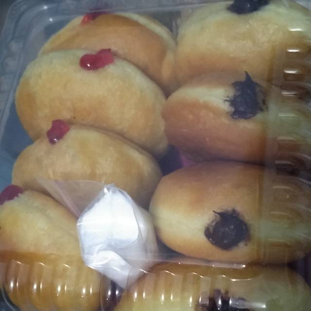 Sebox isi 8 dengan isian coklat dan selai strawberry ditambah gula donat yang bikin donat bomboloni tambah nikmat.