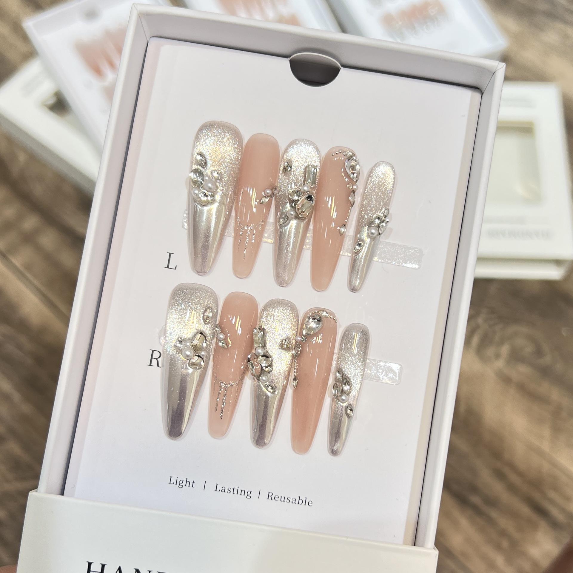 Dorisun Хай-Энд Нюдовый Кошачий Глаз Волшебное Зеркало Французский Маникюр со Съемными Циркониевыми Ногтями с Крошкой из Бриллиантов Medium M