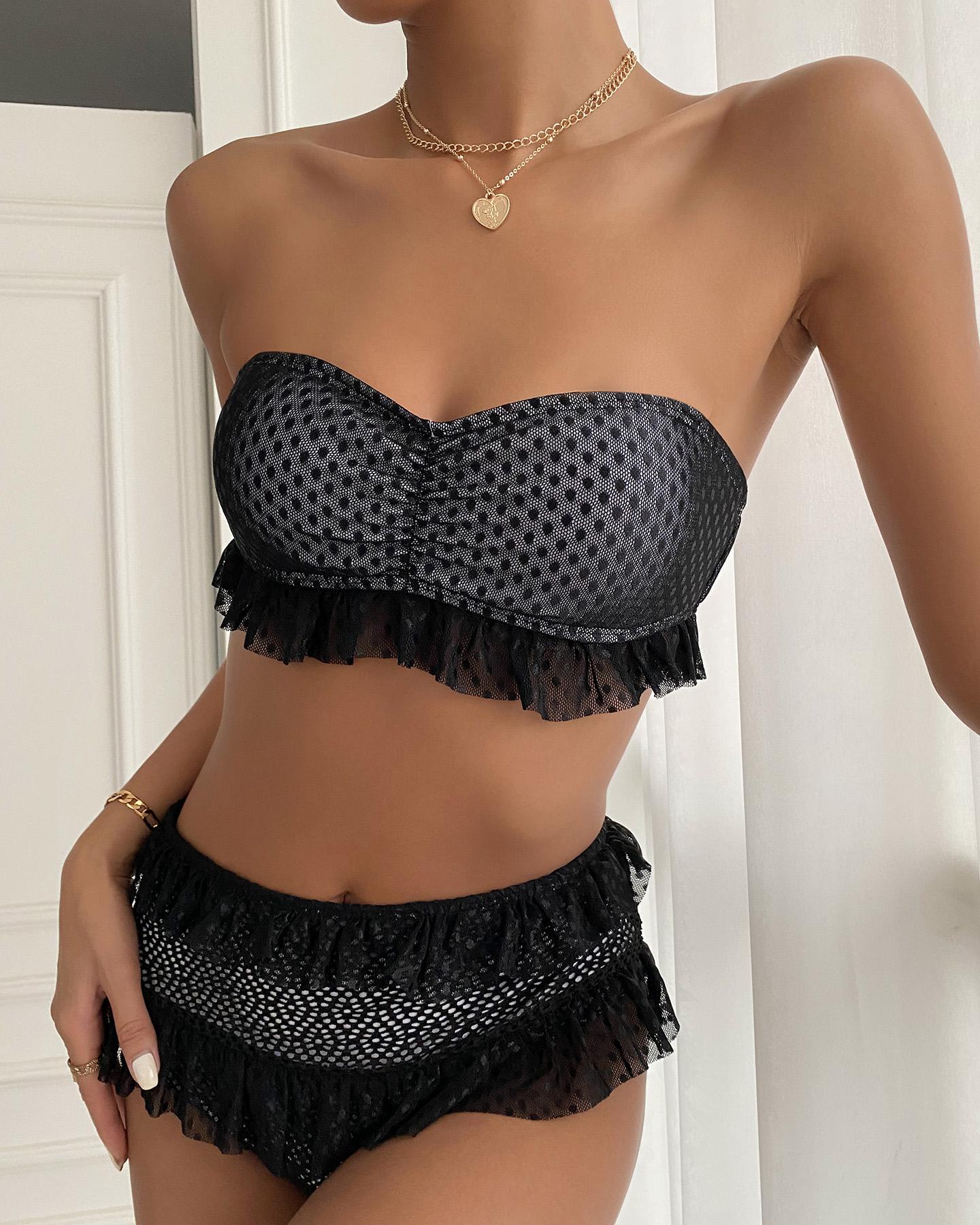 Dot Mesh Ruffles Ruched Bikini Set, Black