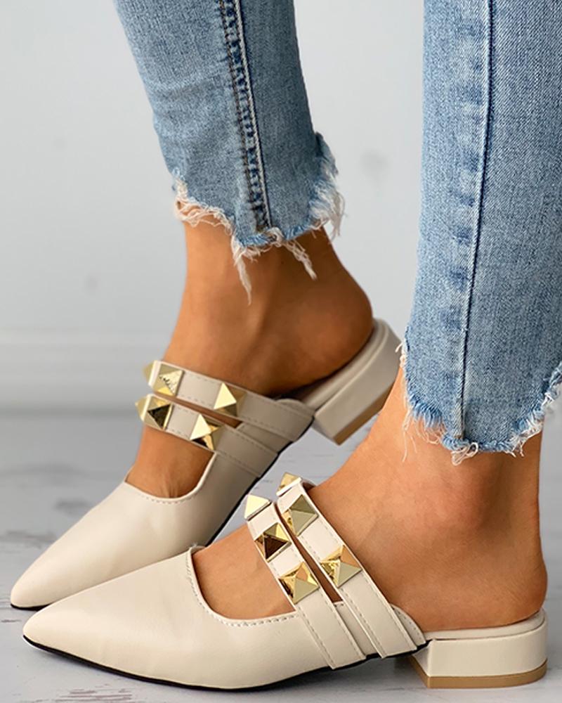 Double Strap Rivet Pointed Toe Slip-on Flats, Beige