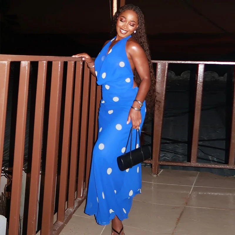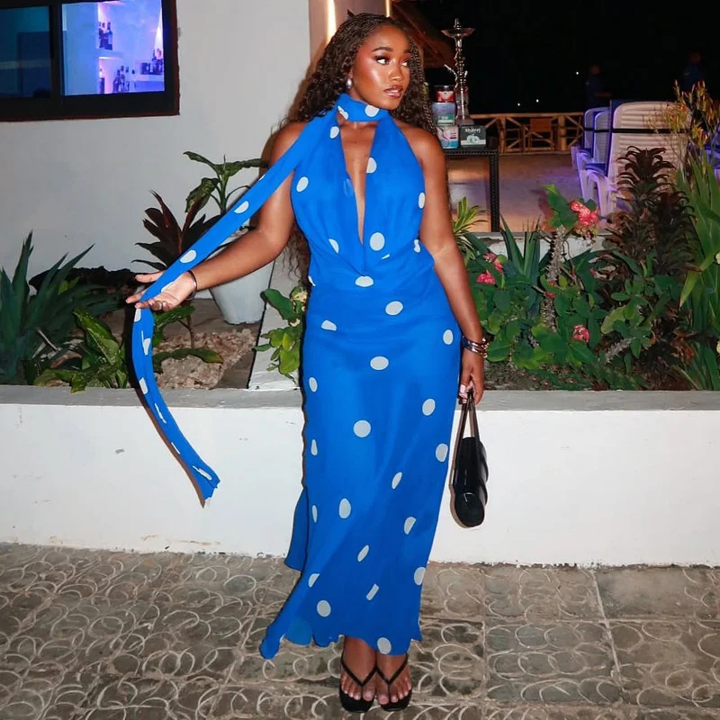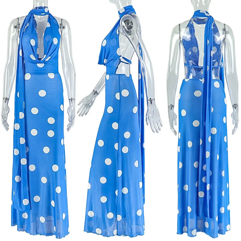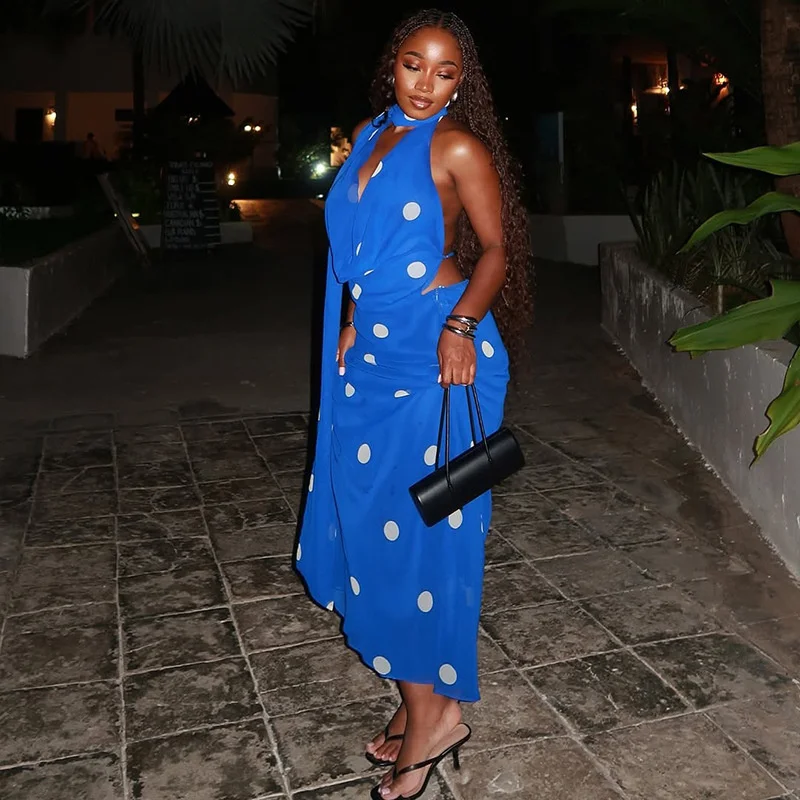 Doyerl Элегантные комплекты платьев в горошек, женские комплекты из двух предметов на день рождения, клубные вечерние платья макси без рукавов с рюшами и v-образным вырезом на спине
