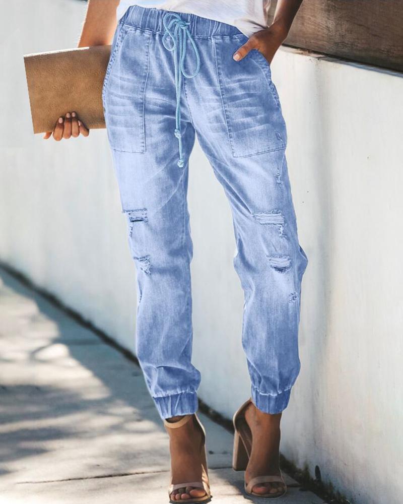 Drawstring Ripped Pocket Design Jeans, Lighted blue