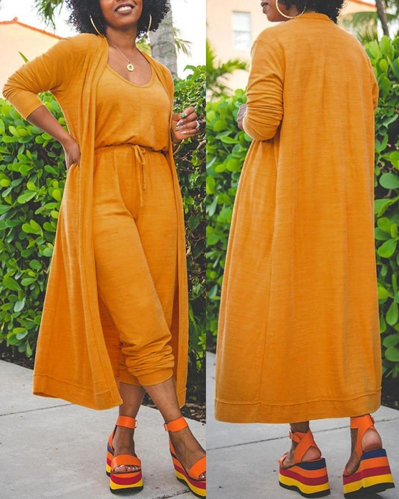 Drawstring V-Neck Jumpsuit & Long Sleeve Cardigan Set, Yellow