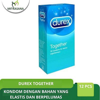 Durex Together 12’S adalah alat kontrasepsi berupa kondom dengan bahan lateks yang tebal dan pelumas lebih banyak sehingga lebih aman dan nyaman saat digunakan. Kondom ini juga mudah disesuaikan dengan bentuk penis berkat fitur Easy-on shape.Manfaat Mencegah kehamilan Mecegah penyakit menular seksualKomposisi Lateks PelumasDosisDisesuaikan dengan kebutuhanAturan Pakai Buka bungkus kondom secara perlahan Pegang kondom dengan sangat hati-hati agar tidak robek Ujung kondom dipegang dengan ibu jari dan telunjuk, kemudian tempatkan kondom pada ujung kepala penis Tarik gulungan kondom hingga ke pangkal penis Setelah selesai, tarik kondom secara perlahan kemudian buang ke tempat sampah Segera ganti kondom baru apabila kondom tiba-tiba robek atau terasa ketat di penisEfek SampingReaksi alergi (apabila memiliki alergi terhadap bahan lateks)