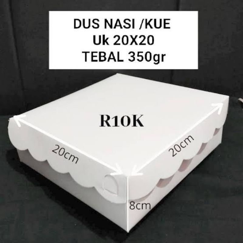 Dus nasi atau kue dengan ukuran 20x20x7 cm ini adalah produk yang dijual. Dus ini memiliki warna putih yang memberikan kesan bersih dan elegan. Ukuran dus yang cukup besar ini dapat menampung nasi atau kue dalam jumlah yang cukup banyak.