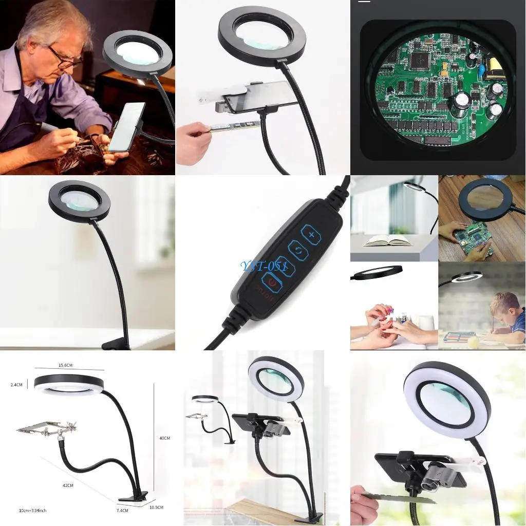 E15A LED Lamp with Clamp 10X 3 Color Modes Magnifier Desk Lamp Reading