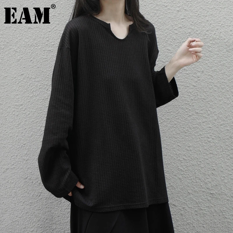 [EAM] Женская черная белая короткая Повседневная футболка большого размера, новая модная футболка с v-образным вырезом и длинными рукавами, ве...