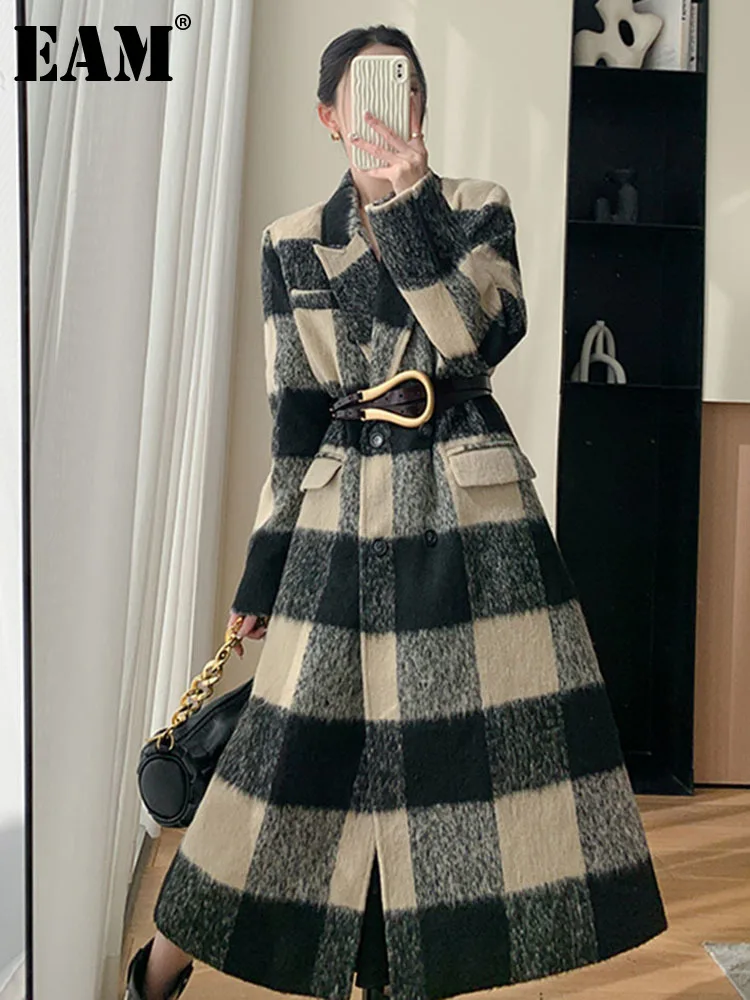 [EAM] Свободная черная клетчатая повседневная шерстяная куртка большого размера, парки, Новая женская модная куртка с длинным рукавом, Осень-зима 2023 1DF3588