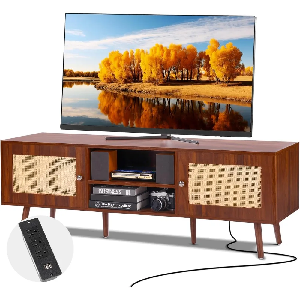 Rattan TV Stand, Mid Century Modern TV Stand for 65 inch TV, Boho Rattan TV Cabinet with Build-in Socket and USB Ports, Adjusta