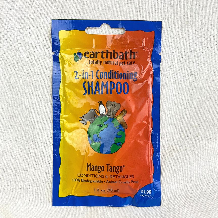 2-in-1 Conditioning ShampooMango Tango1oz (30ml)earthbath Mango Tango 2-in-1 Conditioning Shampoo is a natural shampoo andconditioner in one that is highly effective, heavenly scented, andbiodegradable. Pets coats and skin will look and smell better than ever before,naturally. The lucious essence of tropical mangoes combined with anexceptionally mild shampoo adds brilliance and shine while the extra gentleconditioner softens and detangles, leaving coats wonderfully clean, soft &plush. Will not wash off topical flea applications. Safe for all animals over 6weeks.