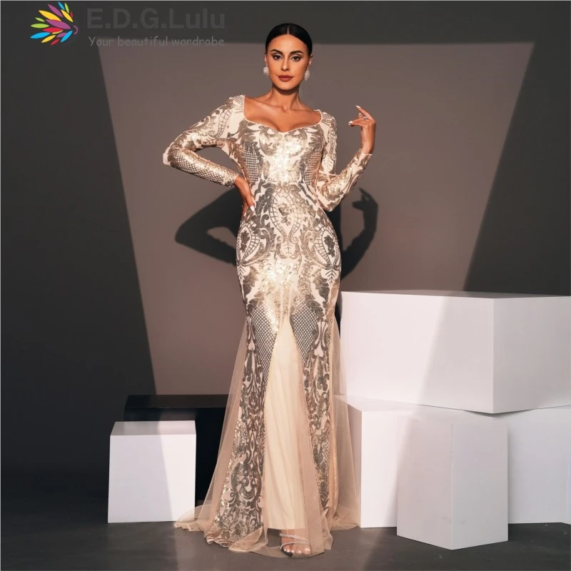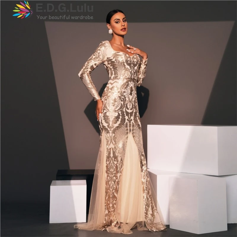 EDGLuLu подиумное Роскошное дизайнерское платье 2024 с квадратным вырезом с принтом золотые блестки лоскутное Сетчатое элегантное платье Вечерние Длинное Вечернее Платье 0624