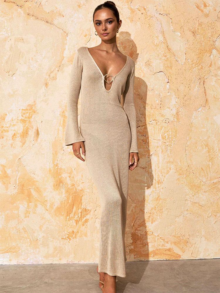 EDOLYNSA Модное металлическое кольцо с V-образным вырезом и длинным рукавом, осень-зима, новое вязаное платье-свитер макси, сексуальное 2024, женские платья для пляжной вечеринки с открытой спиной L бежевый