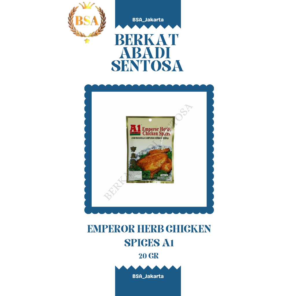 A1 Emperor Herbs Chicken Spices (Bumbu Ayam Maharaja Herba & Rempah) adalah bumbu instan yang dirancang untuk memasak ayam dengan rasa ala masakan herbal tradisional Tiongkok. Bumbu ini mengandung campuran herba dan rempah alami yang berkualitas tinggi, termasuk ginseng, buah goji, dan rempah lainnya. Produk ini diklaim halal dan berasal dari Malaysia.