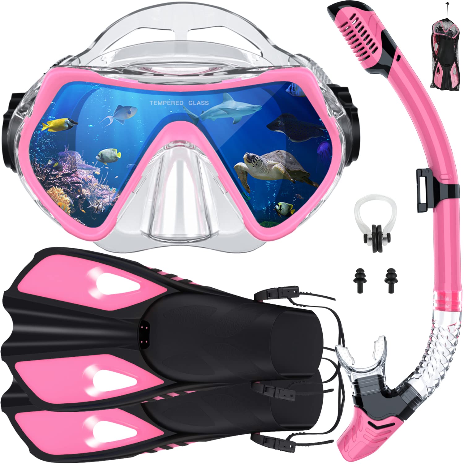 EMSIC Набор для снорклинга Трубка для снорклинга Сухая трубка Широкое поле обзора Закаленное стекло Очки для дайвинга Водонепроницаемые Ударопрочные Устойчивые к давлению Подходящая трубка розовый
