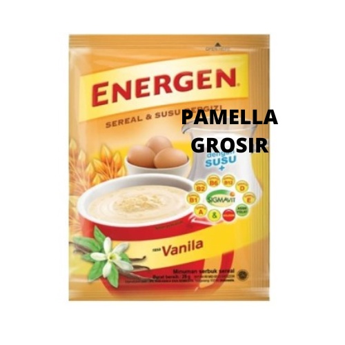 ENERGEN MERUPAKAN MINUMAN SERBUK SEREAL DAN SUSU DENGAN SIGMAVIT YAITU SUMBER VIT A, VIT B1, VIT B2, VIT B6, VIT B12, VIT C, VIT D VIT E, ASAM FOLAT DAN KALSIUM YANG DIBUTUHKAN TUBUH ANDA. DENGAN VARIAN VANILLA 1 RENTENG ISI 10PCS