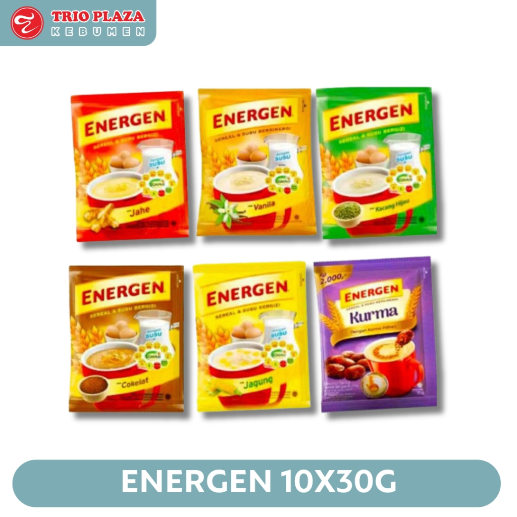 Energen sereal renceng 10x30 gram tersedia varian vanila, coklat, dan kacang hijau.