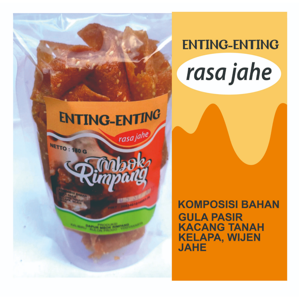 Enting enting Mbok Rimpang Rasa Jahe dibuat dari bahan alami gula kelapa wijen dan campuran jahe. sudah terdapat ijin PIRT. Cocok untuk sajian makanan ringan dan pas untuk oleh oleh karena produk ini termasuk makanan lokal yogyakarta.