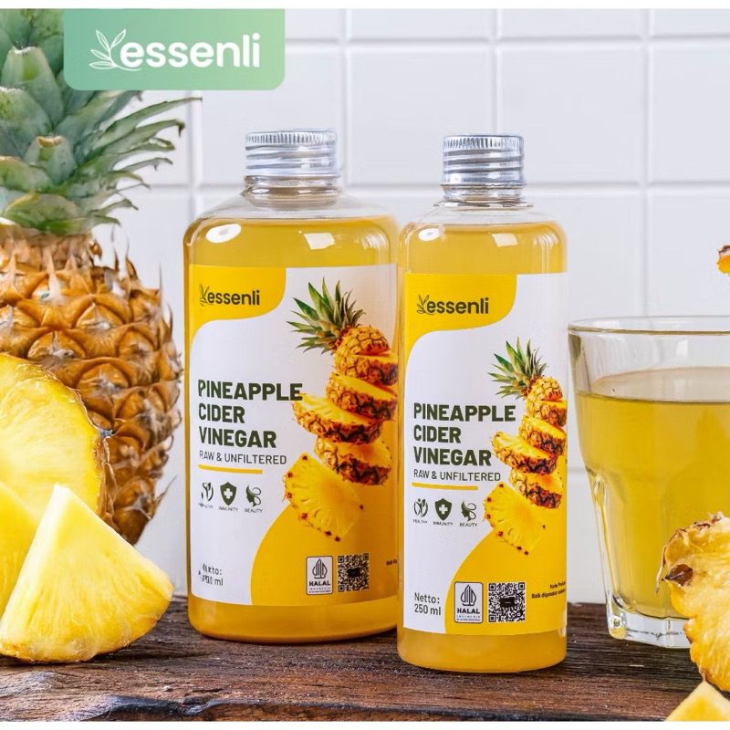 Cuka Nanas Essenli dibuat tanpa proses pemanasan atau filterasi, difermentasi secara alami untuk mengawetkan "Mother", atau inang cuka. Didalam mother ini terkandung enzymes, protein dan bakteri probiotik yang sangat bagus untuk kesehatan.