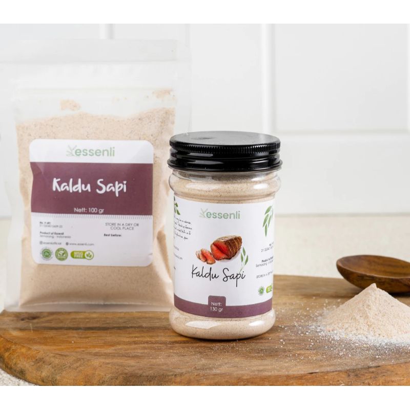 Kaldu Sapi Essenli terbuat dari sari rebusan daging atau tulang sapi yang diolah menjadi bubuk untuk memperkaya rasa masakan anda. Bisa digunakan untuk sup atau tumisan.