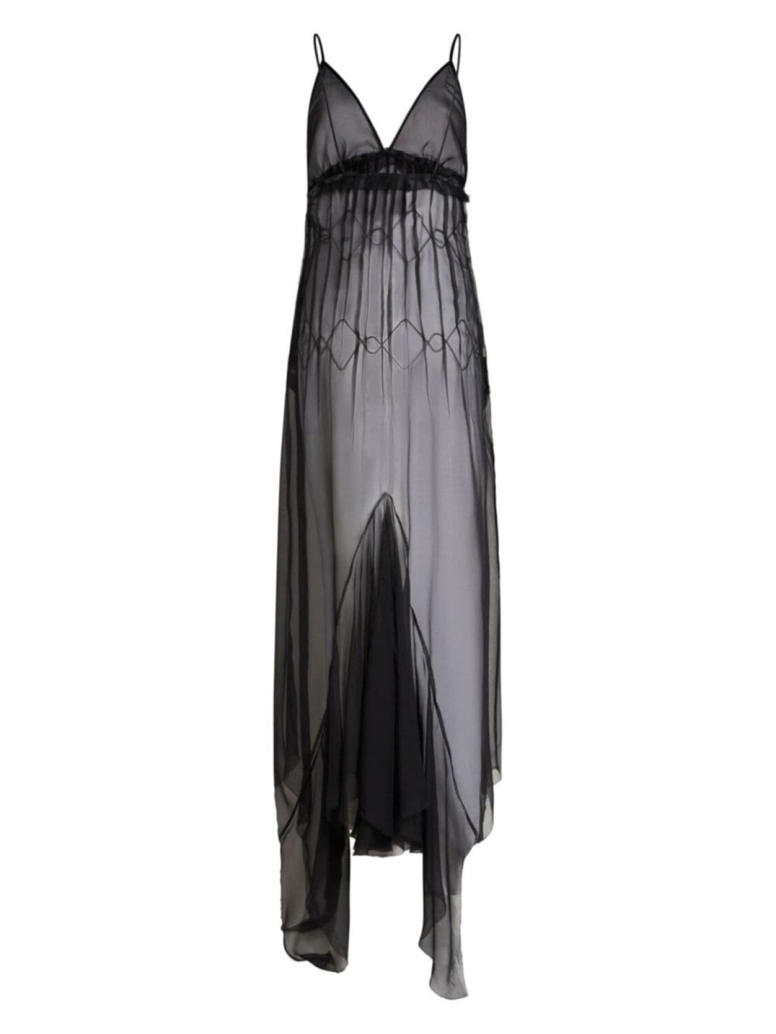 Подробнее о товаре: • черный • шелк • V-образный вырез • без застежки • легкий материал • тонкие бретели • асимметричный подол • высота по щиколотку