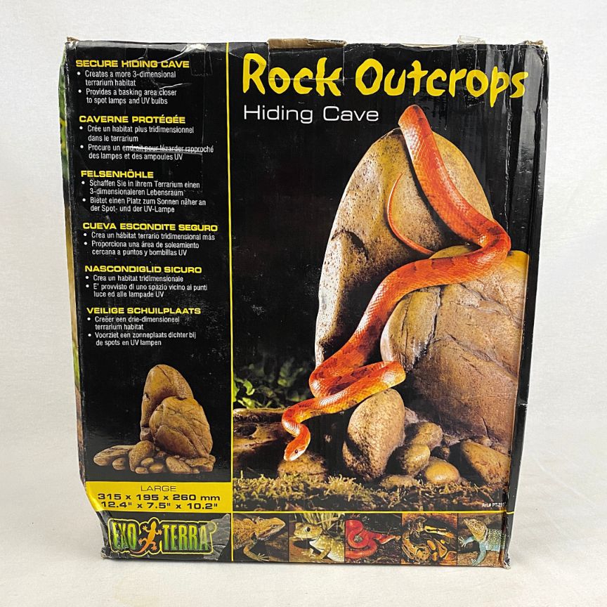 Exo Terra Rock Outcrops help create a more 3-dimensional habitat in all types ofterrariums. The shape of these Rock Outcrops enables them to fit nicely in smallspaces, minimizing wasted space within the terrarium and generating baskingareas closer to the top screen. The multiple entrance holes turn this RockOutcrop into a secure hiding space, preventing stress. 315 x 195 x 260mm / 12.4”x 7.5” x 10.2”- Creates a more 3-dimensional terrarium habitat- Provides a basking area closer to spot lamps and UV bulbs- Extremely realistic rock look- Multi entrance hide out prevents stress- Very stable design- Easy to clean
