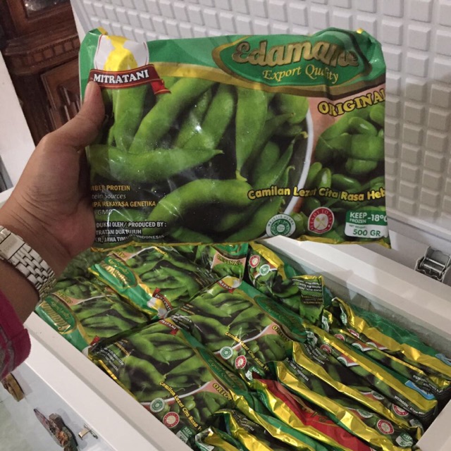 Edamame adalah kacang kedelai Jepang yang kaya manfaat seperti protein dan juga asam folat. Edamame ini kualitas ekspor, dan bebas transgenik. Kalau mau ngemil sehat tanpa ndatangi penyakit ya ngemil edamame saja. Buat yang kagi diet tentu bagus, begitu juga buat ibu hamil atau menyusui. Produk sudah ready to eat jadi tak perlu direbus atau dikukus lagi. Cukup di rendam air panas atau air dingin sebentar.
