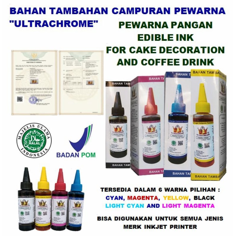 Bahan tambahan pangan pewarna "Ultra Chrome" tersedia dalam warna black, magenta, cyan, light cyan, light magenta dan yellow.