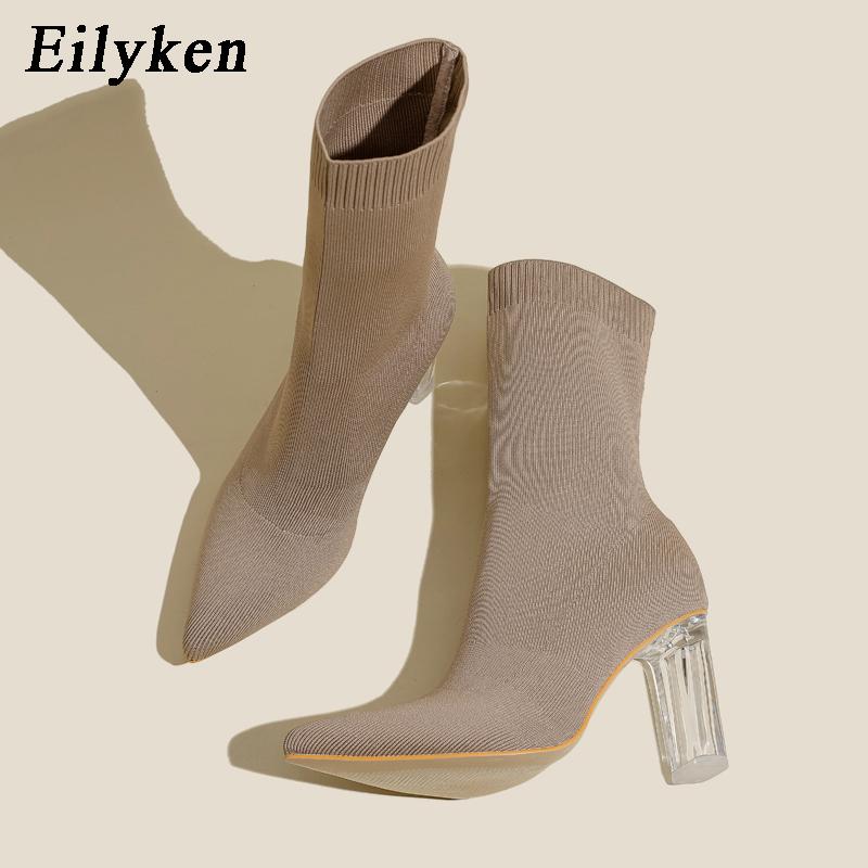 Eilyken, прозрачные женские ботильоны на высоком каблуке, уютная вязаная зимняя дизайнерская обувь из эластичной ткани с острым носком