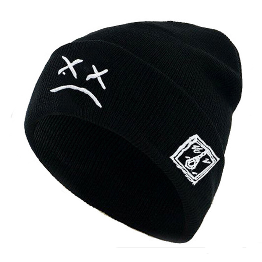 hats,embroidered knitted hat with sad face expression