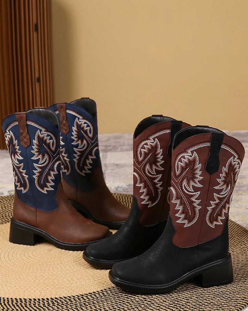 Embroidery Colorblock Round Toe Chunky Cowboy Boots, Brown