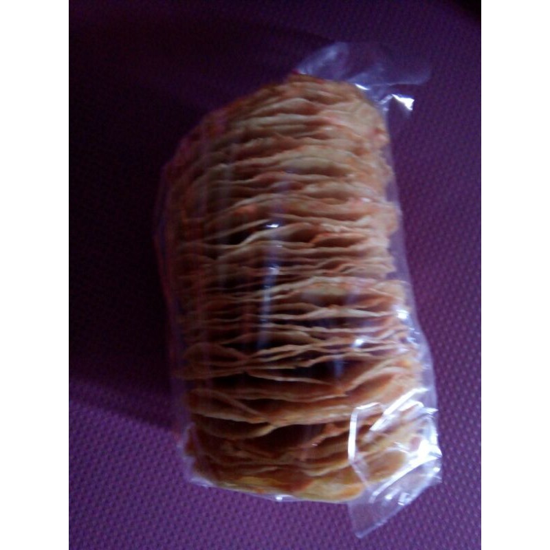 1 bungkus isi 50 keping, beratnya antara 400gr hingga.500gr, tergantung ketebalan melinjo.