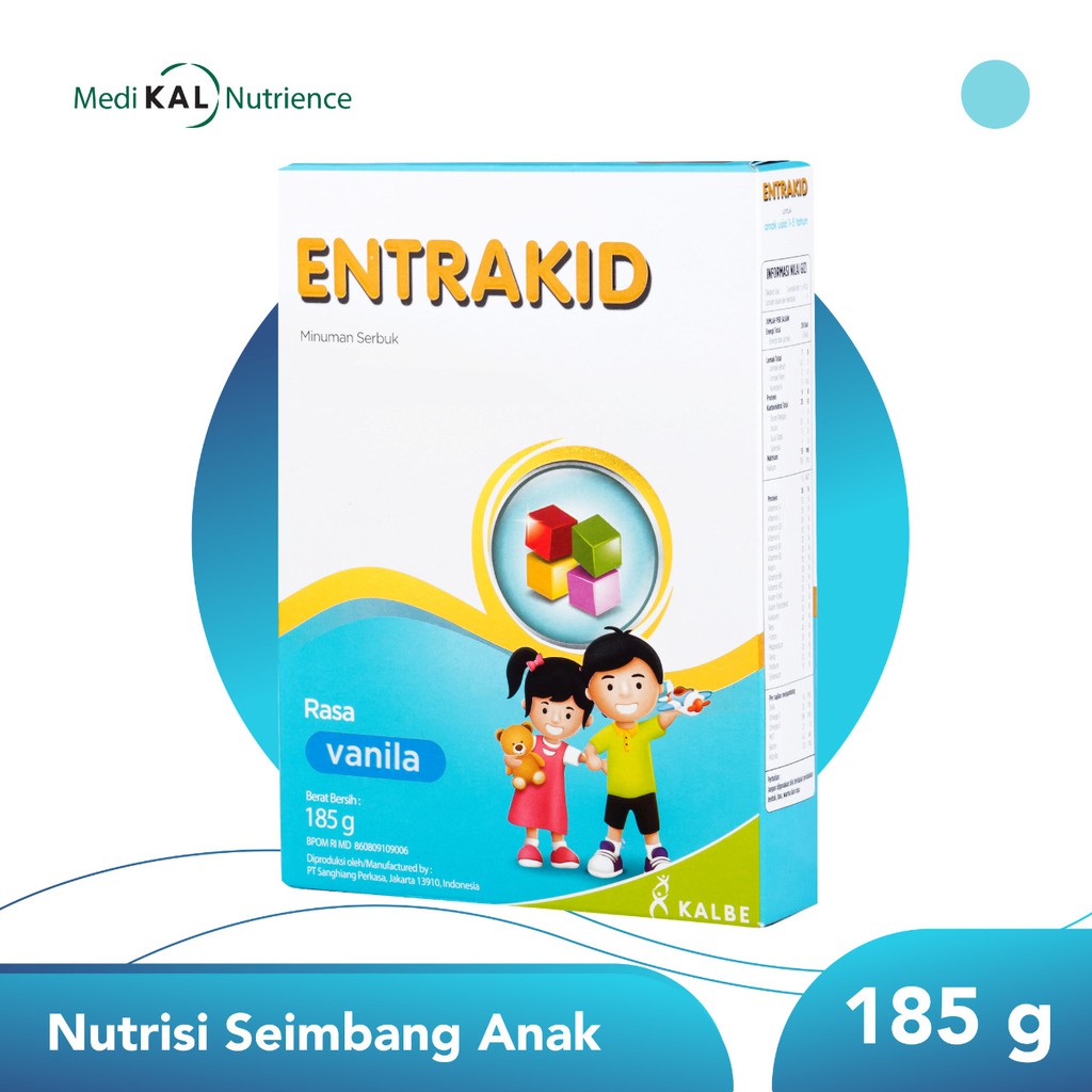 DetailsEntrakid adalah Makanan cair berupa susu anak yang mengandung gizi lengkap dan seimbang dengan Formula Enteral yang dapat membantu memenuhi kebutuhan gizi harian anak terutama yang memiliki masalah makan pada usia 1-5 tahun di masa pertumbuhannya. Makro dan Mikro nutrisi untuk membantu pertumbuhan dan perkembangan anak. Beberapa kondisi anak dengan masalah makan, seperti: Pemenuhan kebutuhan gizi yang sulit dipenuhi dari makanan biasa. Tahap penyembuhan sakit. Anak sulit makan. Berat Badan kurang. Spesifikasi: Berat 185gr Rasa Vanila Minuman serbuk Keunggulan: Formula Enteral : Kandungan makronutrient dengan komposisi Karbohidrat, Protein dan Lemak yang seimbang (Karbohidrat 56%, Protein 12% dan Lemak 31%) DHA, Omega 3 dan Omega 6 dari sumber nabati murni Vitamin dan mineral penting Serat pangan (Inulin) Sumber Protein Whey Rasa yang enak disukai Anak-anak. Kegunaan: Untuk penambah nafsu makan anak. Untuk tumbuh kembang otak dan mata. Untuk fungsi imun dan meningkatkan kesehatan saluran pencernaan sehingga nafsu makan anak meningkat.