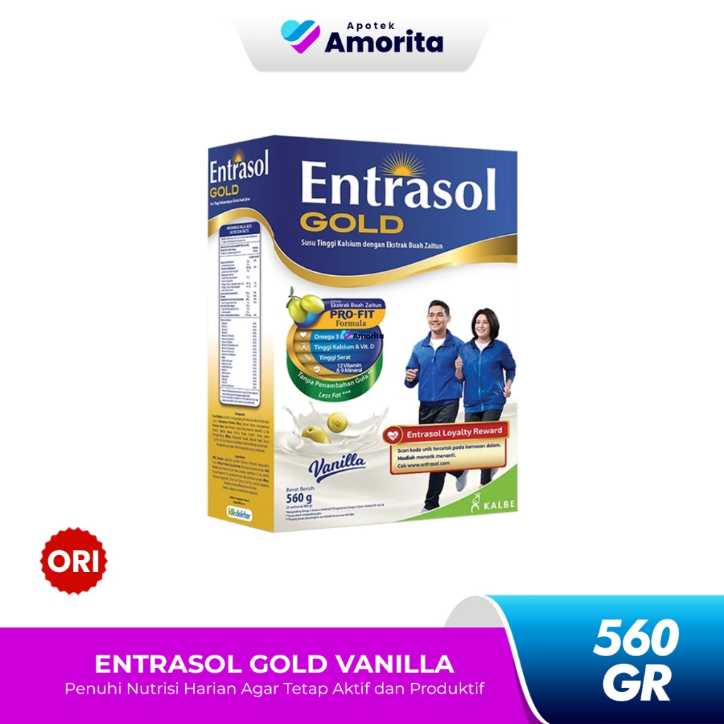 Entrasol Gold Vanilla 560g adalah nutrisi tinggi kalsium dengan ekstrak buah zaitun dilengkapi dengan Pro-Fit Formula (Omega 3&6, Tinggi Kalsium & Vitamin D, Tinggi Serat, 10 Vitamin & 5 Mineral) serta lebih rendah gula untuk membantu penuhi nutrisi harian agar tetap aktif dan fit serta memperlambat terjadinya osteoporosis.