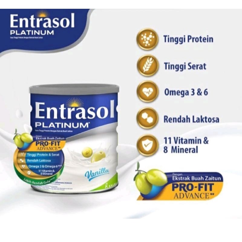 Entrasol Platinum merupakan Nutrisi Tinggi Protein dengan Ekstrak Buah Zaitun yang dilengkapi dengan Pro-Fit Advance Formula: tinggi serat, omega 3 &6, 11 Vitamin & 8 Mineral, Lebih Rendah Gula serta Rendah Laktosa sehingga nyaman di perut.