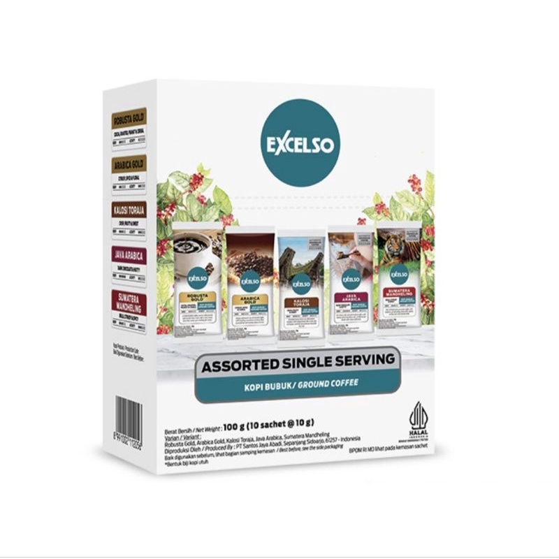 Excelso Single Serving Assorted Pack merupakan Kopi Single Serving yang dikemas menjadi satu dengan macam-macam varian rasa. Tiap paket terdapat 2 sachet dari semua varian rasa Excelso Single Serving. Produk yang sangat cocok untuk kamu yang ingin coba berbagai macam varian rasa Excelso Single Serving