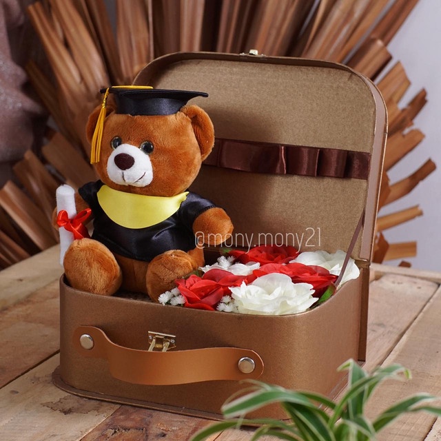 Box unik berbentuk koper coklat dan cream dengan rangkaian bunga cantik ditambah dengan boneka wisuda yang lucu.